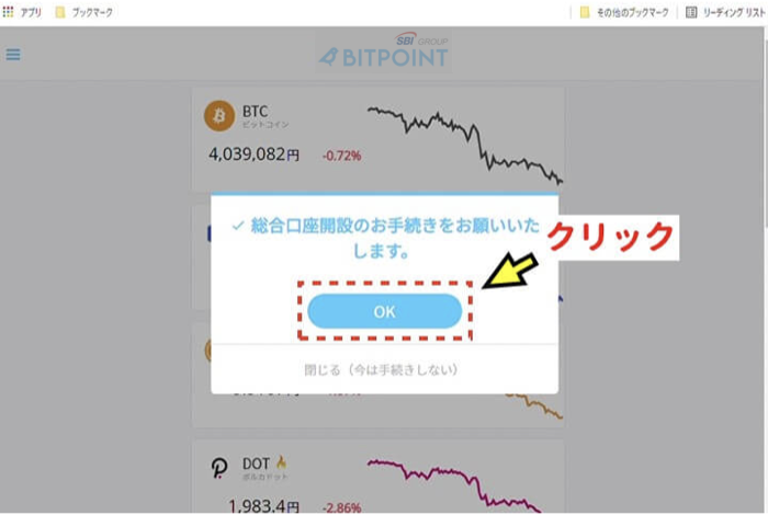 すると「総合口座開設のお手続きをお願いいたします。」というポップアップが表示されますので「OK」をクリックします。